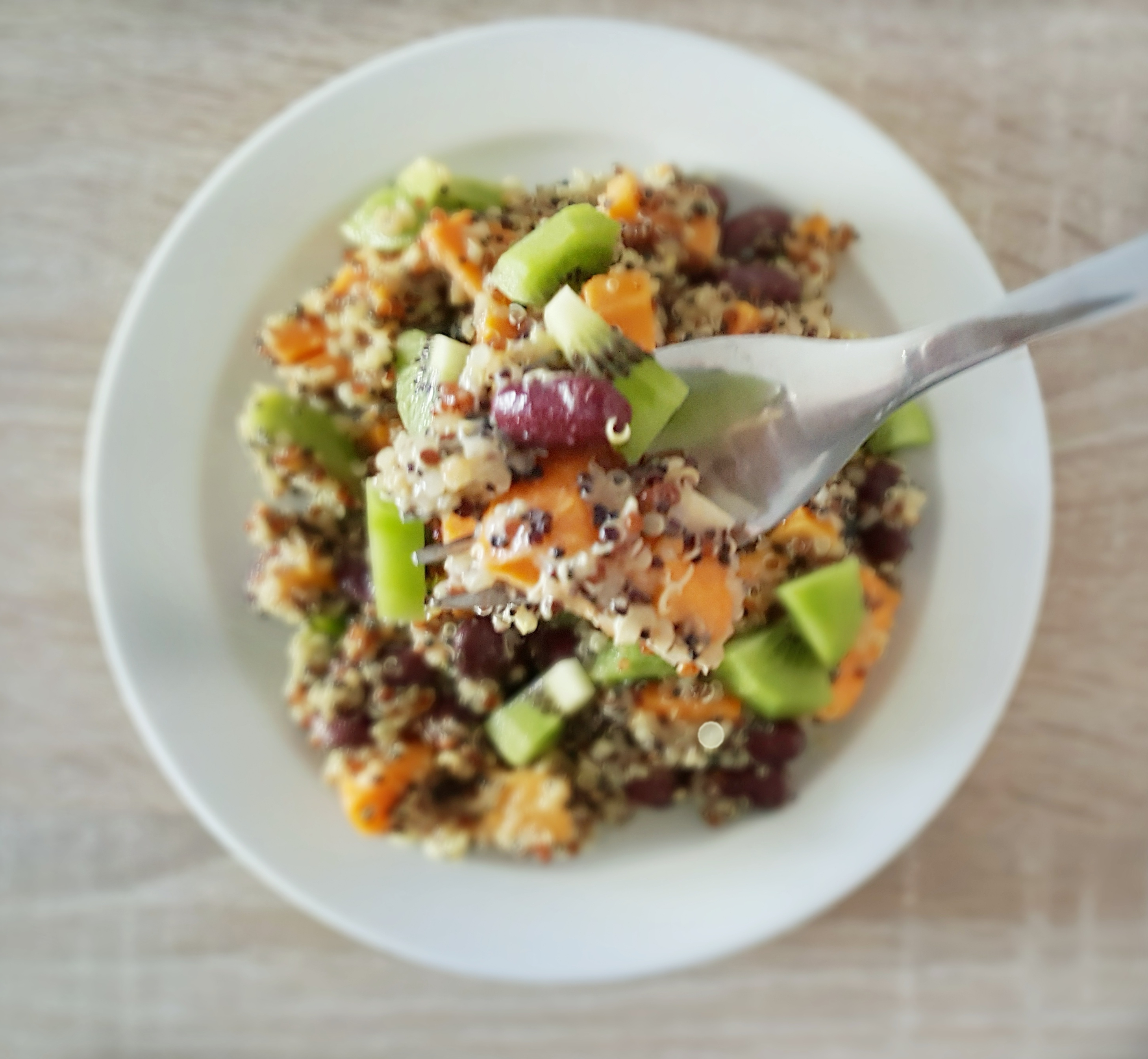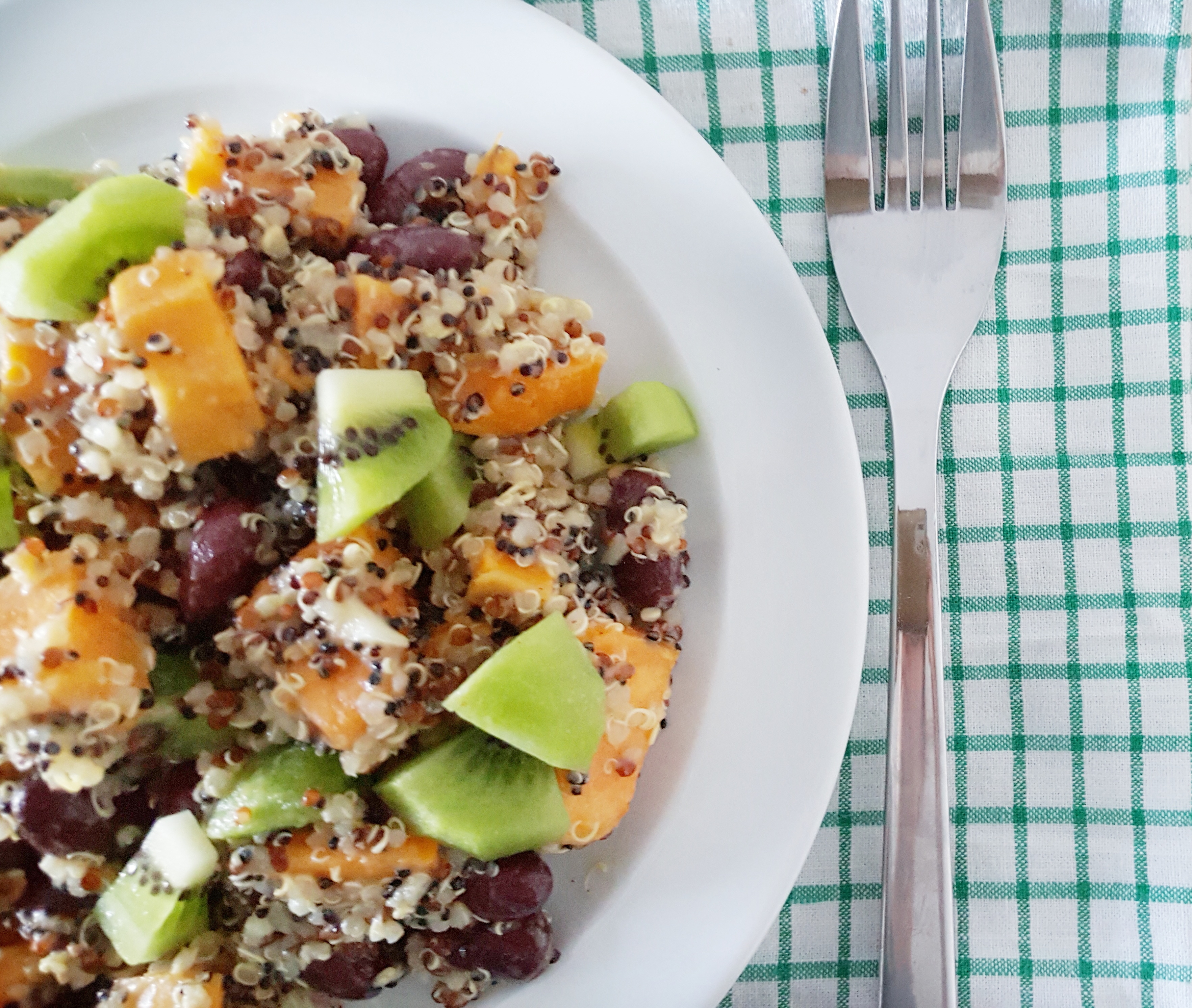 Jeśli o kasze chodzi to quinoa czyli komosa ryżowa jest ich królową. Ziarenka są jednym z najlepszych źródeł białka roślinnego, kasza zawiera wiele cennych witamin i minerłów, a do tego jest bezglutenowa. Szczególnie interesująca jest zawartość żelaza, magnezu i cynku. Jedna szklanka gotowanej komosy, może dostarczyć nawet do 25 % dziennego zapotrzebowania na cynk czy magnez. Dodając do kaszy witaminę C, w sałatce jest to kiwi, wzrasta przyswajalność żelaza (ok. 25% do 50 % dziennego zaptrzebowania).