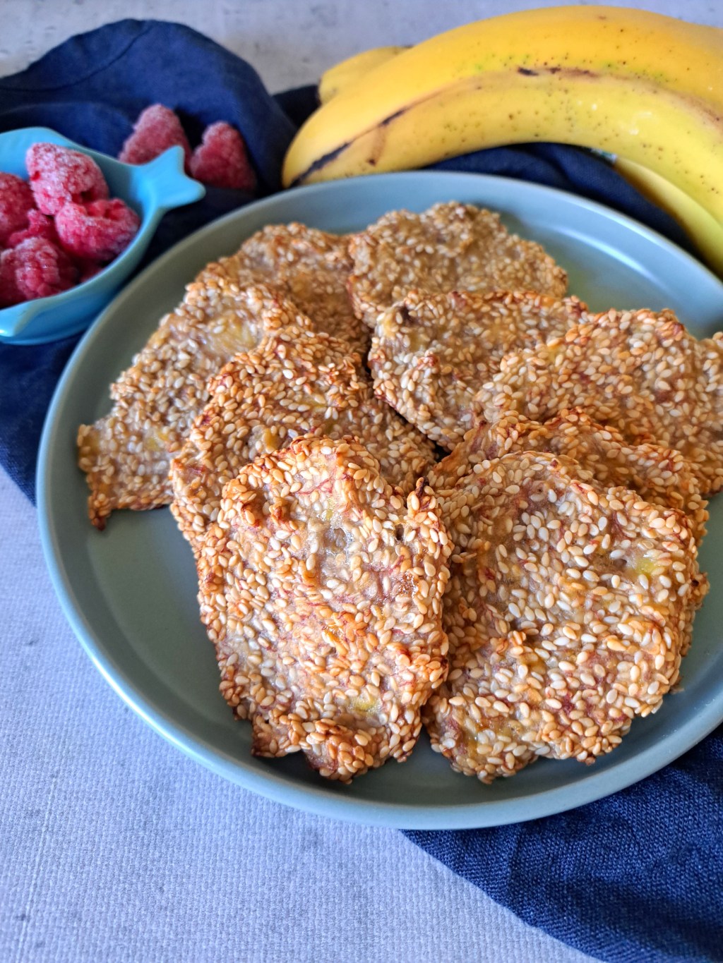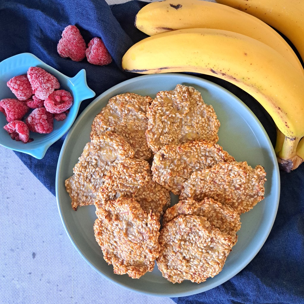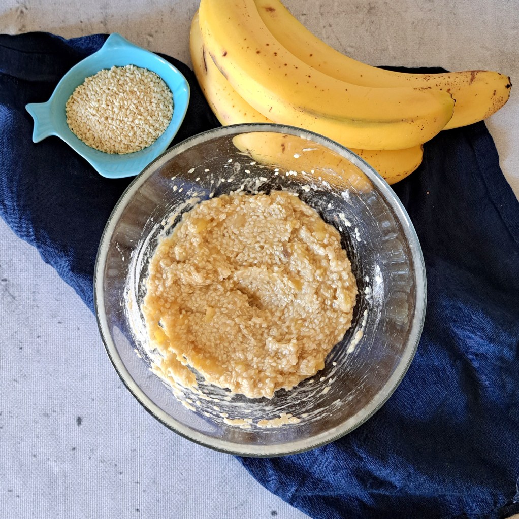 1. Banany zgnieść na papkę, dodaj sezam i mąkę. Wymieszaj dokładnie.